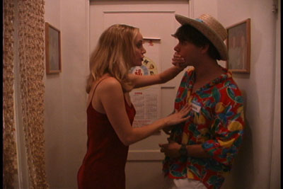 Jill helping Lance hold back his vomit while waiting for the bathroom.