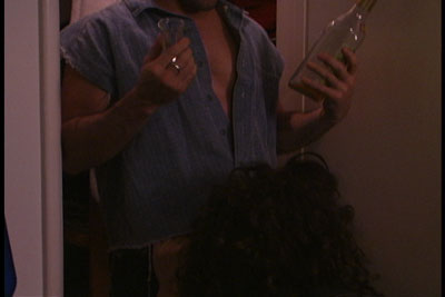 Amy sewing Scott's pants while he drinks shots of Tequila.